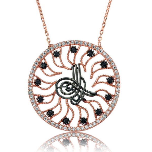 Gümüş Arapça Muhammed Yazılı Bayan Kolye İslam Peygamberi Hz. Muhammed’in isminin arapça yazılı olduğu kolye ile sevdiklerinize hem anlamlı hem de güzel bir hediye verebilirsiniz. Böylelikle sevdiklerinizi dini ve derin bir anlama sahip gümüş kolye ile sevindirebilirsiniz. Bu şık kolye modeli 925 ayar gümüşten imal edilmiştir. Gümüş üzerine rose altın kaplama yapılmıştır. Rose altın kaplama yapılan gümüş kolye modelleri parlaklığını uzun süre muhafaza eder, oksitlenmesi gecikir. Üzerinde bulunan taşlar zirkondur. Zincir boyu ortalama 45 cm’dir. Ürünlerimizin tamamı el emeği ile üretilmiştir. Gümüş ve değerli taşlar nedeniyle belirtilen ortalama ürün ağırlığında ± %10 sapma olabilmektedir.
