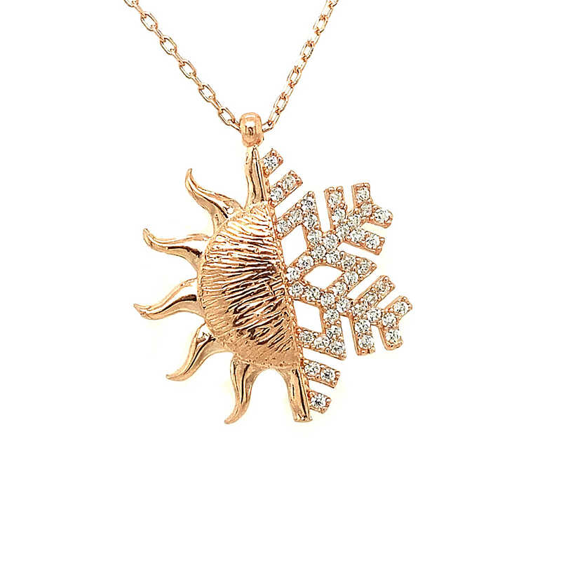 Güneş; ışığın, bilginin, iyiliğin, gücün ve yönetimin sembolüdür. Bu ışıl ışıl ve farklı tasarımıyla göz kamaştıran kolye; 925 ayar gümüşten imal edilmiştir. Gümüş üzerine rose kaplama yapılmıştır. Rose kaplama yapılan gümüş ürünler parlaklığını uzun süre muhafaza eder, oksitlenmesi gecikir. Gümüş güneş kartanesi bayan kolye üzerinde bulunan taşlar zirkon’dur. Tüm gümüş kolyelerde olduğu gibi gümüş güneş bayan kolye de tamamı el emeği ile üretilmiştir. Gümüş ve değerli taşlar nedeniyle belirtilen ortalama ürün ağırlığında ± %10 sapma olabilmektedir.