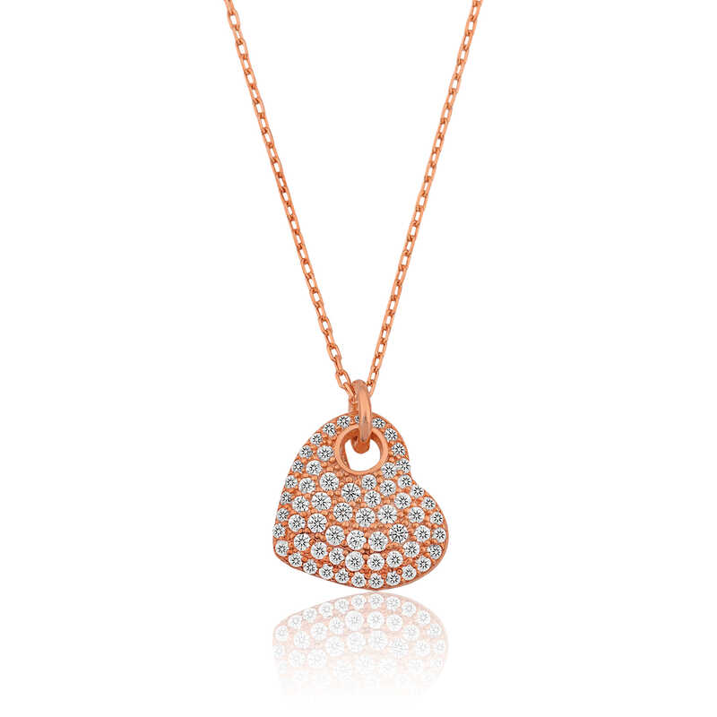 Kalp simgesi daima koşulsuz sevginin ve aşkın sembolü olmuştur. Dini öğretilerde ise kalbin gücü sınırsızdır. Çünkü kalp Yaradanın evi, bizim ise evrene açılan gerçeklik kapımızdır. Bu şık gümüş kalp kolye; doğum günü hediyesi, sevgililer günü hediyesi veya annelere hediye olarak özel günlerde tercih edilebilecek mükemmel bir seçenektir. Gümüş kalp bayan kolye 925 ayar gümüşten imal edilmiştir. Bu kolye üzerinde rose kaplama yapılmıştır. Rose kaplama yapılan gümüş bayan kolye modelleri parlaklığını uzun süre muhafaza eder. Üzerinde bulunan taşlar zirkondur. Tüm gümüş bayan kolye modellerimizde olduğu gibi gümüş kalp bayan kolye modeli de el emeği ile üretilmiştir. Gümüş ve değerli taşlar nedeniyle belirtilen ortalama ürün ağırlığında ± %10 sapma olabilmektedir.